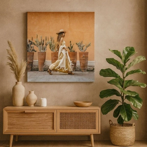 Impression sur toile - Image sur toile - Une femme dans un style bohème avec des pots de cactus en arrière-plan. - 80x120cm - Style hippie - Décoration murale moderne pour le salon et la chambre ARTTOR