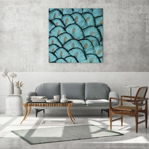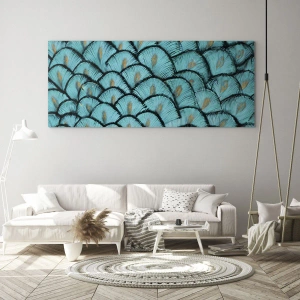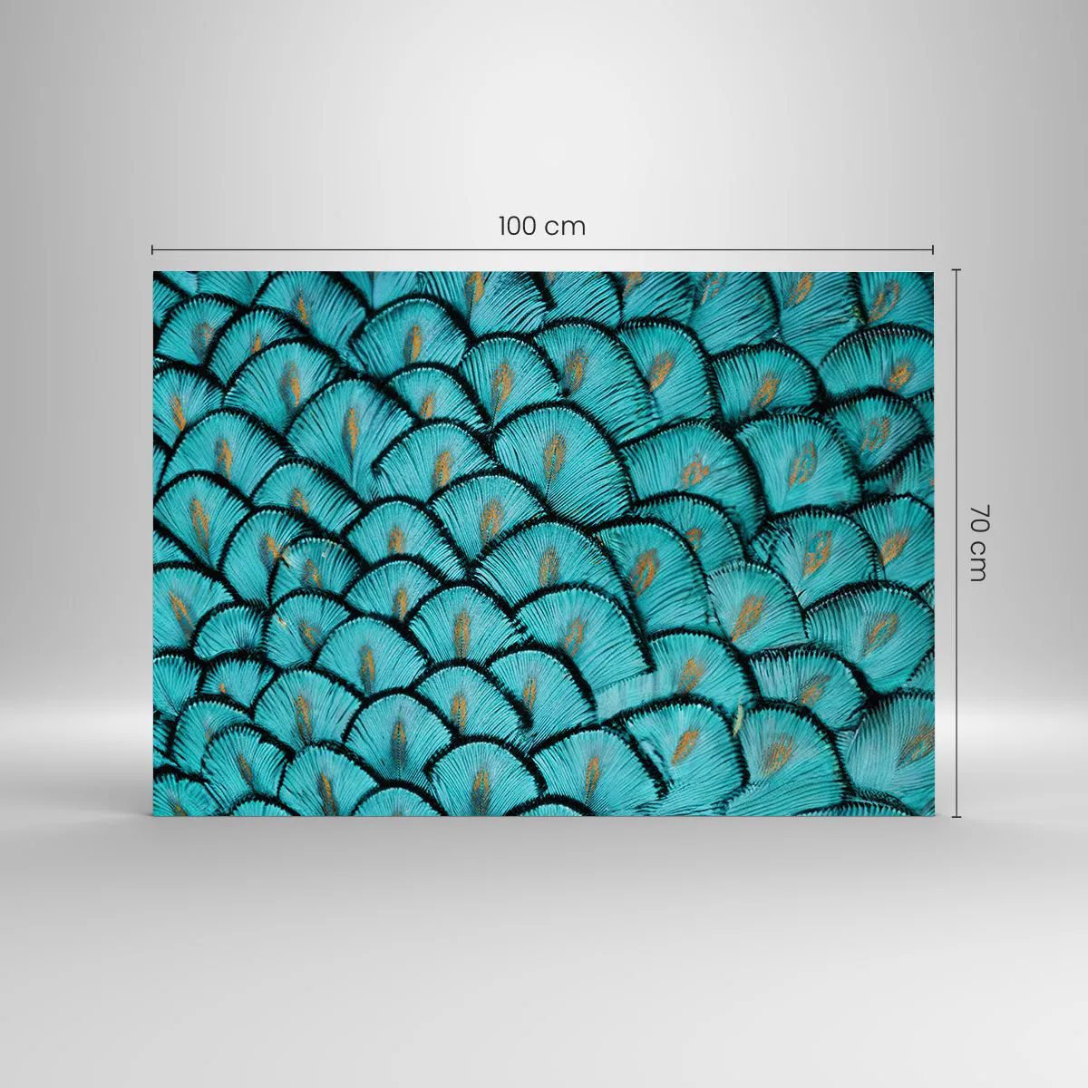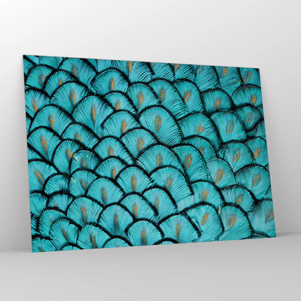 Impression sur verre - Image sur verre - Gros plan de plumes de paon turquoise formant un motif décoratif. - 100x70cm - Le grand gala des plumes - Décoration murale moderne pour le salon et la chambre ARTTOR