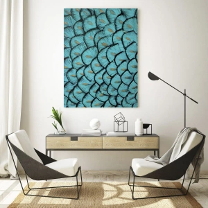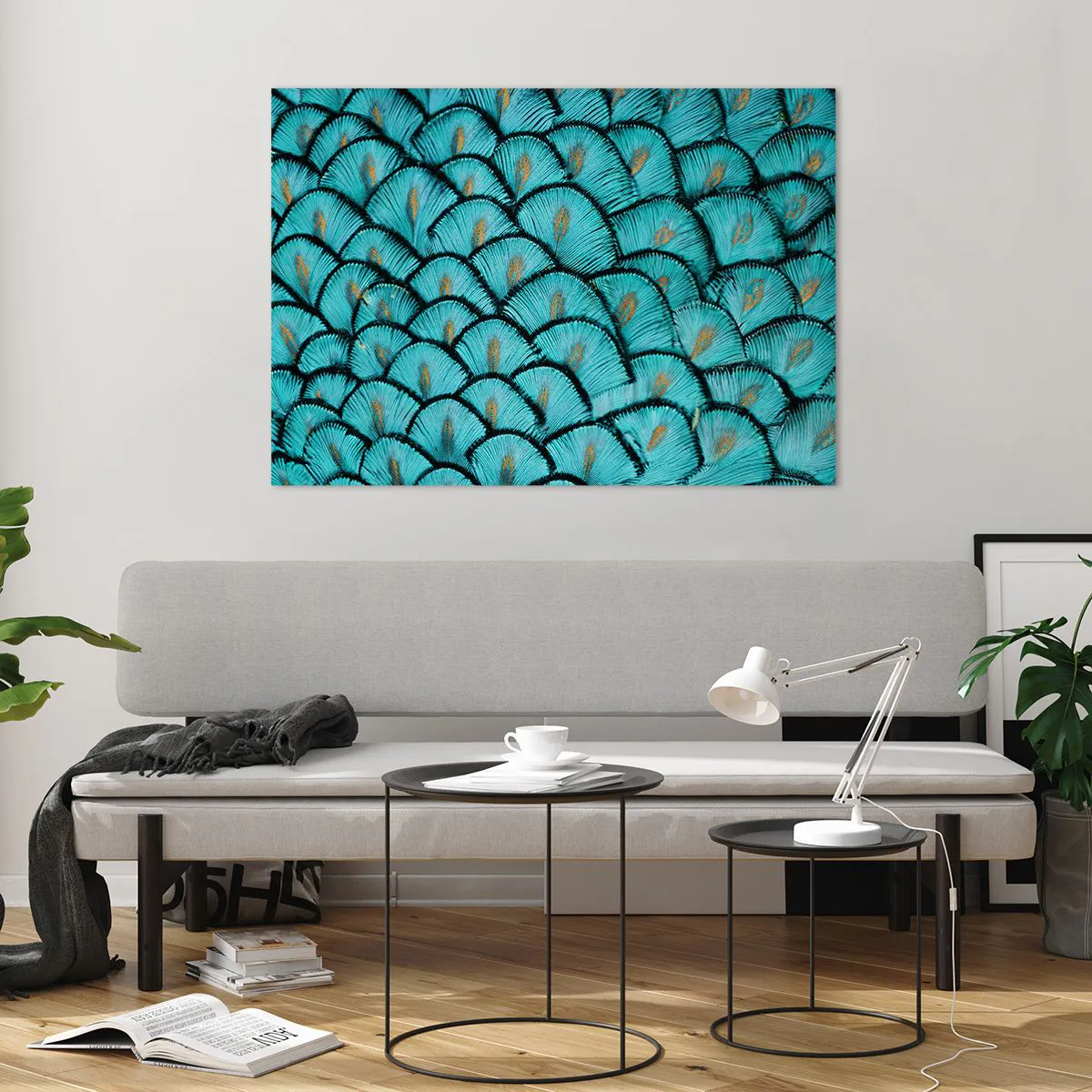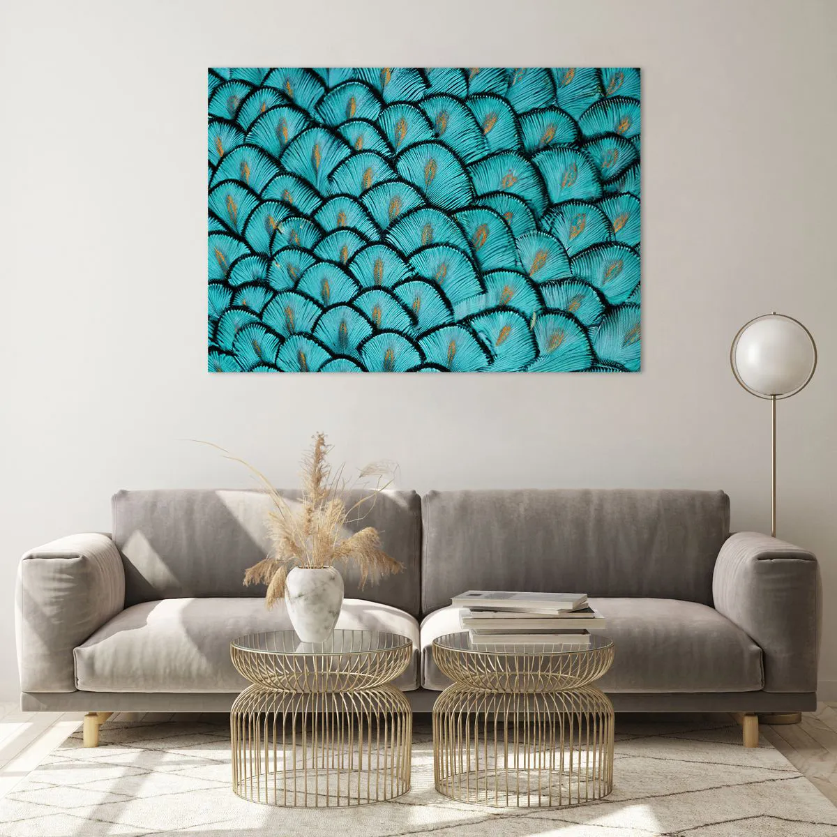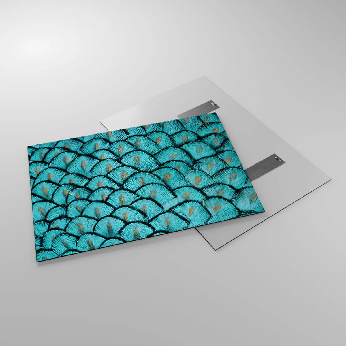Impression sur verre - Image sur verre - Gros plan de plumes de paon turquoise formant un motif décoratif. - 100x70cm - Le grand gala des plumes - Décoration murale moderne pour le salon et la chambre ARTTOR