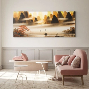Impression sur verre - Image sur verre - Paysage oriental avec bateaux et montagnes dans le brouillard - 70x50cm - Plus loin que l'Extrême-Orient - Décoration murale moderne pour le salon et la chambre ARTTOR