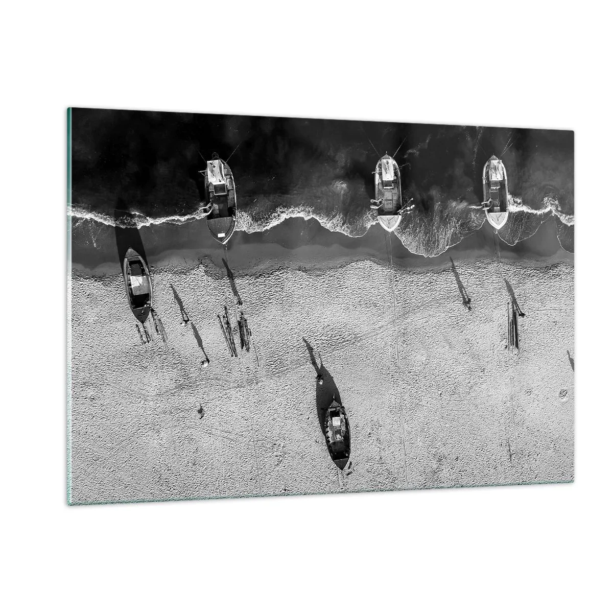 Impression sur verre - Image sur verre - Bateaux noirs et blancs et leurs ombres sur une plage de sable vue d'en haut - 120x80cm - Toujours sur le rivage… - Décoration murale moderne pour le salon et la chambre ARTTOR