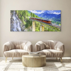 Impression sur verre - Image sur verre - Des montagnes russes sur un pont avec vue sur une cascade et des montagnes - 160x50cm - Train dans les Alpes - Décoration murale moderne pour le salon et la chambre ARTTOR