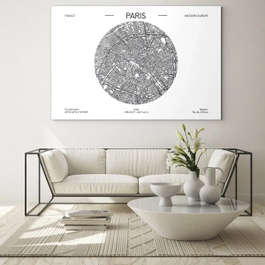 - Illustration en noir et blanc représentant un plan de Paris dans une composition circulaire. Son style minimaliste et ses lignes épurées lui confèrent une touche de modernité. Une décoration intérieure élégante avec une touche d'inspiration urbaine.