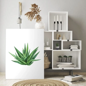 Les feuilles charnues et pointues de la plante ont été reproduites avec une attention particulière aux détails : elles révèlent de délicates transitions de tons et de subtils jeux d'ombre et de lumière. La disposition des feuilles crée une forme harmonieuse, presque symétrique, qui attire le regard et apporte un ordre à la composition. Les nuances de vert sont entrecoupées de reflets plus clairs, conférant à l'image une impression de tridimensionnalité et de légèreté. Chaque feuille semble vivre à son propre rythme, et l'ensemble, malgré sa forme statique, vibre de vie et de vitalité. Cette représentation de la plante symbolise le pouvoir de survie et de renouveau. Grâce à son esthétique sobre et à son fond blanc, ce tableau s'inscrit parfaitement dans les tendances du minimalisme et du style naturel. Il ne distrait pas, mais attire l'attention sur la forme de vie : sa structure, son dynamisme et son énergie. Le vert symbolise le renouveau, la paix et la vitalité depuis des siècles, et ce tableau met parfaitement en valeur ces qualités. Il peut devenir un symbole d'équilibre, de santé et d'harmonie intérieure, notamment dans les espaces du quotidien. Dans les intérieurs minimalistes, il apportera une touche distinctive, apportant un rythme naturel et un équilibre visuel à l'ensemble. La plante, motif principal, joue ici un rôle thérapeutique, apaisant le psychisme et les sens. Cette peinture sur verre horizontale de 70 x 50 cm d'ARTTOR a été réalisée grâce à une technologie moderne d'impression sur verre. Cela donne des couleurs intenses et des détails parfaitement reproduits. Le verre apporte brillance et modernité à l'œuvre, tout en servant de couche protectrice. Résistante aux UV et à la décoloration, la peinture est facile à entretenir. Durable et esthétique, elle est idéale pour les intérieurs contemporains. La surface lisse et brillante du verre reflète la lumière sur la peinture, la mettant en valeur dans l'espace. Cet effet met en valeur ses qualités visuelles et lui confère une profondeur presque organique.