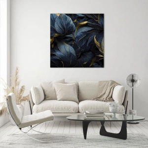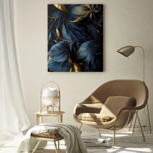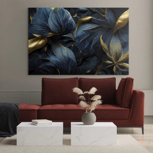 - Ce tableau présente des feuilles bleu foncé travaillées avec art, rehaussées de touches dorées. La composition dégage élégance, atmosphère et luxe, parfaite pour les intérieurs raffinés.