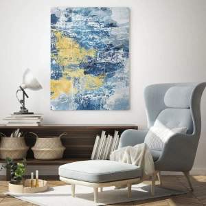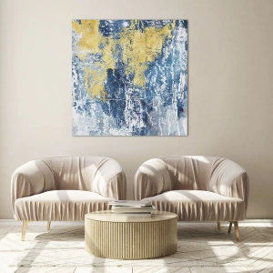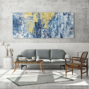 Impression sur verre - Image sur verre - Abstraction dans les tons de bleu et de jaune - 120x50cm - Abstraction du temps - Décoration murale moderne pour le salon et la chambre ARTTOR