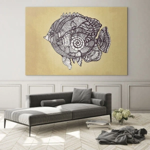 Impression sur verre - Image sur verre - Un poisson de dessin animé avec des ornements sur un fond beige - 120x80cm - D'un océan d'ornements - Décoration murale moderne pour le salon et la chambre ARTTOR
