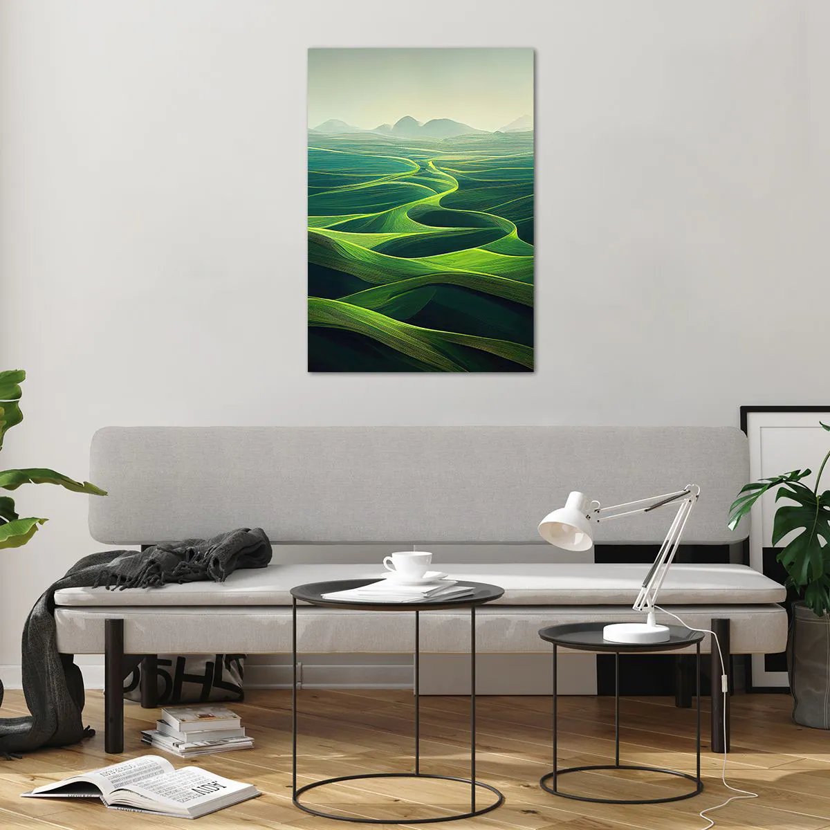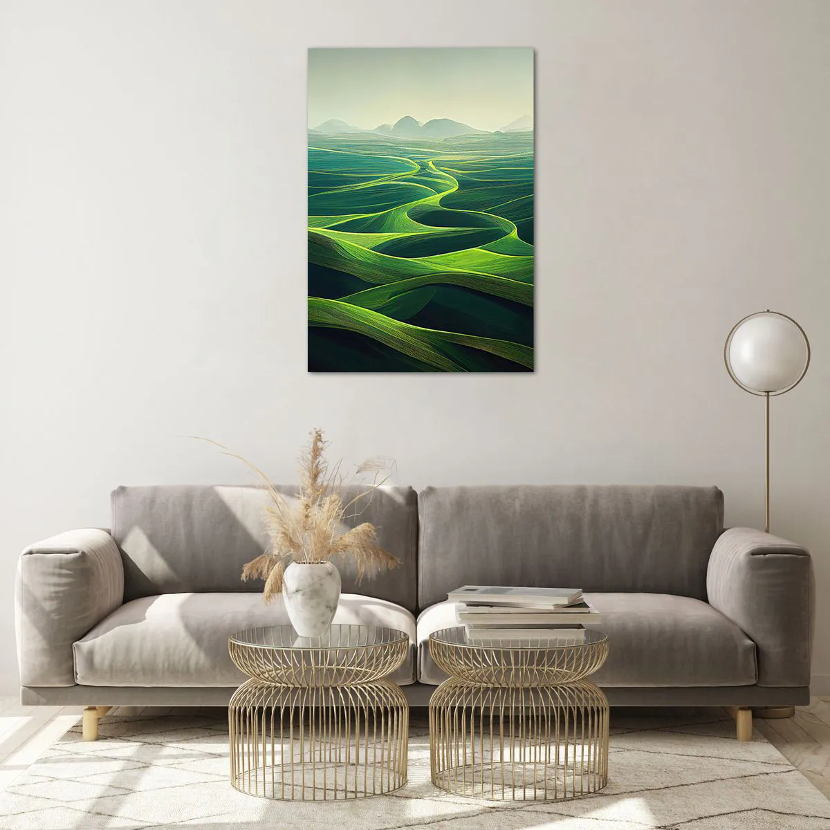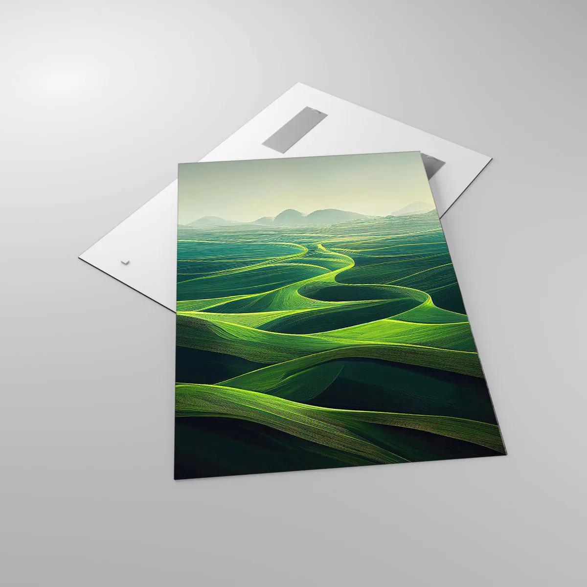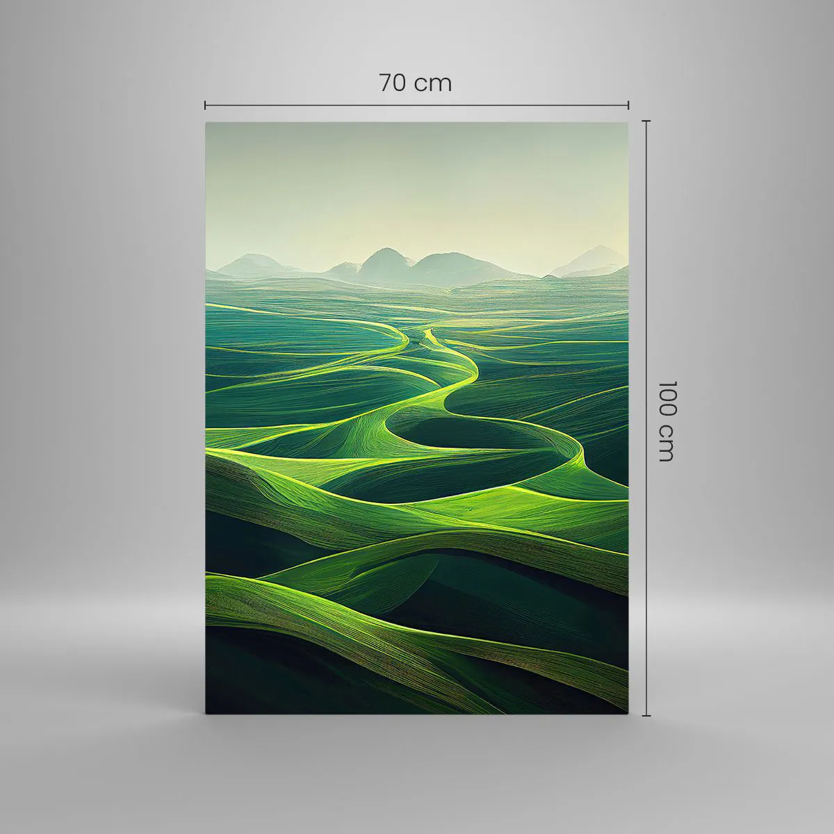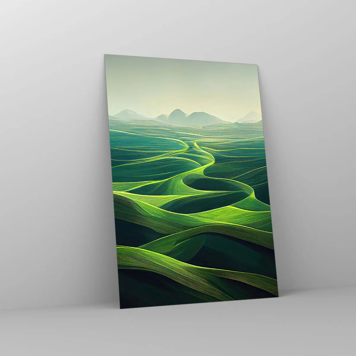 Impression sur verre - Image sur verre - Collines verdoyantes avec des sentiers vallonnés - 70x100cm - Dans les vallées verdoyantes - Décoration murale moderne pour le salon et la chambre ARTTOR