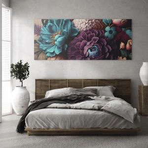 Impression sur verre - Image sur verre - Un bouquet de fleurs aux couleurs intenses sur fond sombre - 140x50cm - La nature en abondance - Décoration murale moderne pour le salon et la chambre ARTTOR