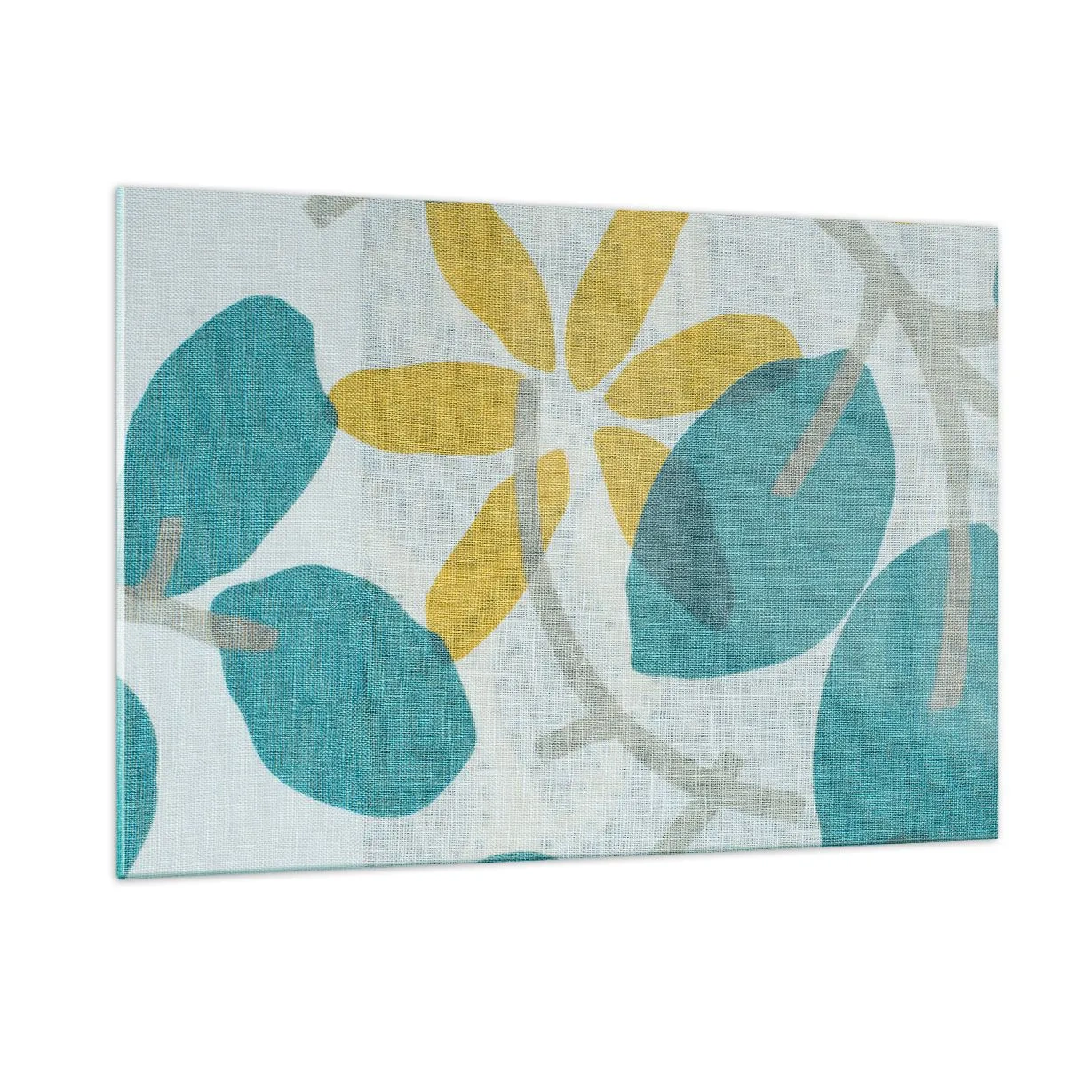 Impression sur verre - Image sur verre - Un graphique végétal avec des feuilles azur et des fleurs jaunes - 120x80cm - Wśród lazurowych liści - Décoration murale moderne pour le salon et la chambre ARTTOR