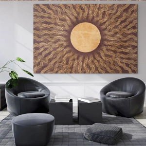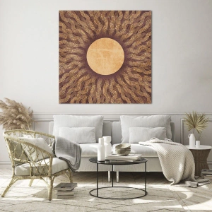 Impression sur verre - Image sur verre - Un soleil stylisé avec des rayons en forme de lignes ondulées sur un fond marron. - 100x70cm - Icône du soleil - Décoration murale moderne pour le salon et la chambre ARTTOR