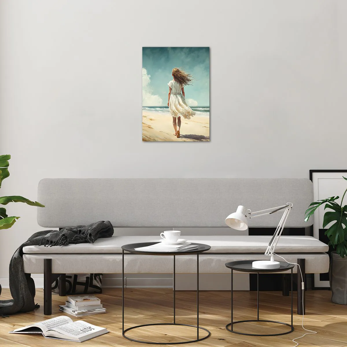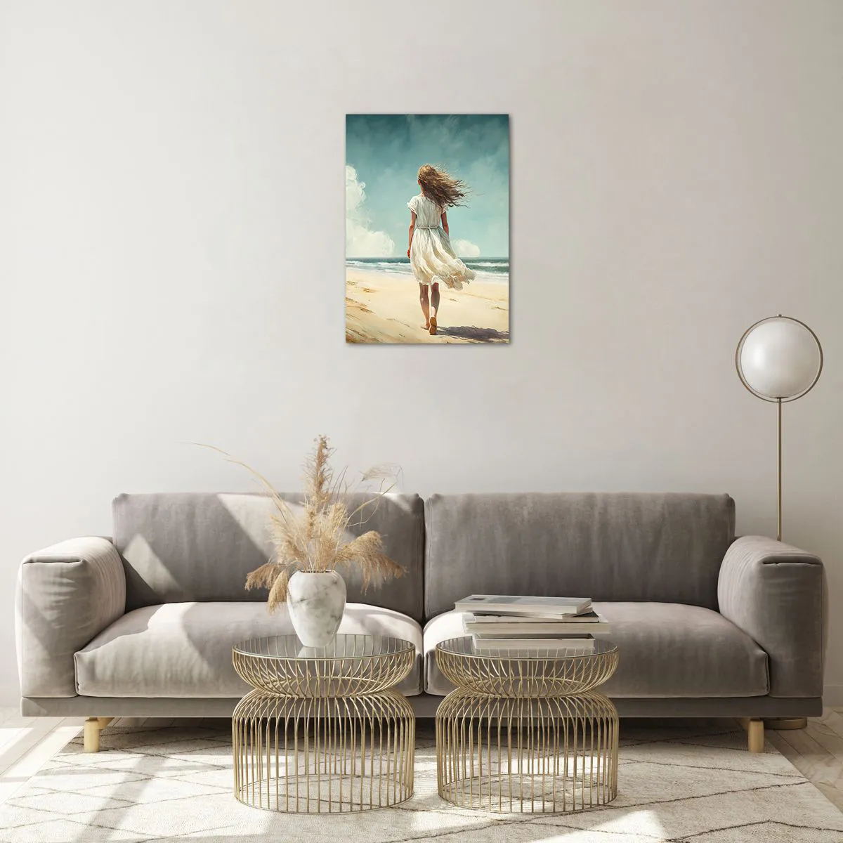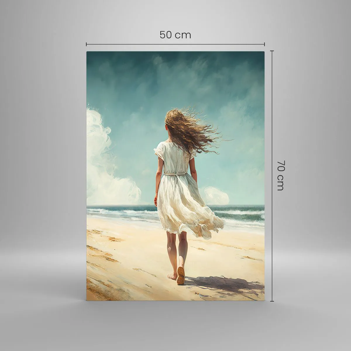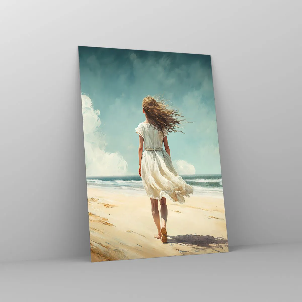 Impression sur verre - Image sur verre - Une femme en robe blanche marchant pieds nus sur une plage ensoleillée - 50x70cm - Pour rencontrer le soleil et le vent - Décoration murale moderne pour le salon et la chambre ARTTOR