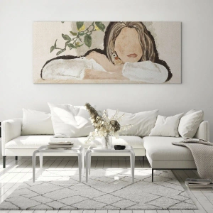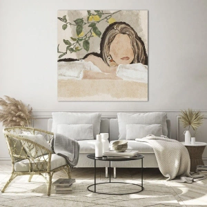 Impression sur verre - Image sur verre - Une femme appuyée sur une table parmi les branches d'un citronnier, le visage sans traits. - 50x70cm - La beauté du sud - Décoration murale moderne pour le salon et la chambre ARTTOR