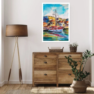 Affiche - Poster - Une aquarelle colorée d'un yacht dans une ville balnéaire - 50x70cm - Après-midi arc-en-ciel - Décoration murale moderne pour le salon et la chambre ARTTOR
