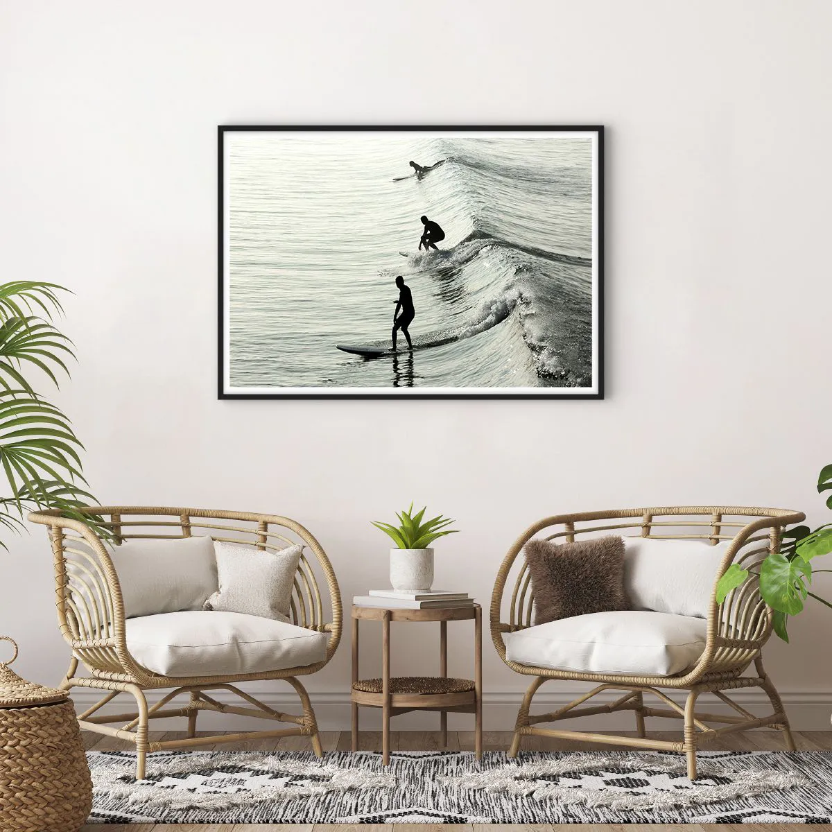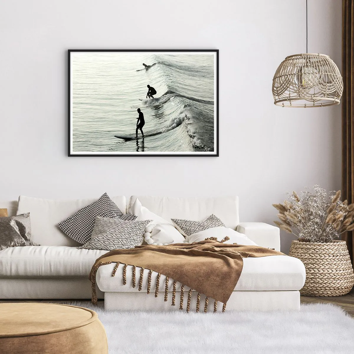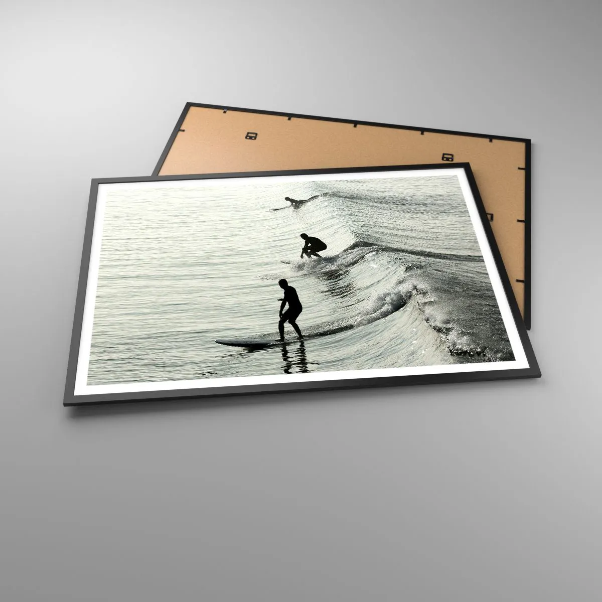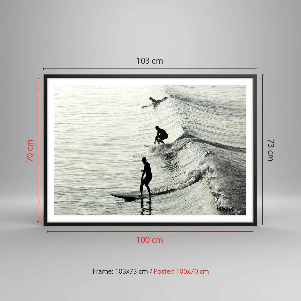 Affiche dans un cadre noir - Poster - Surfeurs sur les vagues dans une photo monochrome - 100x70cm - A la rencontre de la vague - Décoration murale moderne pour le salon et la chambre ARTTOR