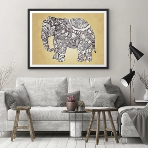Affiche dans un cadre noir - Poster - Éléphant dessiné à la main avec un motif orné sur un fond beige - 70x50cm - L'éléphant s'est apprêté - Décoration murale moderne pour le salon et la chambre ARTTOR