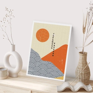 • L'affiche présente un design japonais minimaliste avec des vagues et un soleil. La composition géométrique aux couleurs chaudes capture l'harmonie et l'esthétique de l'art traditionnel.