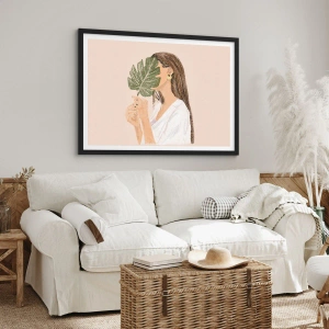 L'illustration est décorée de couleurs terreuses délicates, ce qui lui confère un caractère harmonieux et apaisant. Le fond beige s'harmonise parfaitement avec le vert de la feuille et les détails subtils du portrait. Ce style rend cette affiche parfaite pour les espaces de style bohème, scandinave ou minimaliste.