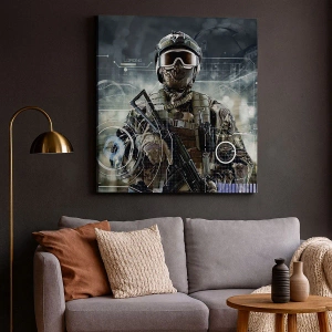 - Un tableau moderne représentant un soldat portant un casque futuriste, un masque de protection et une arme sur fond de technologie de pointe. Ce motif dynamique est parfait pour les intérieurs modernes.