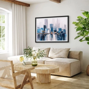 Affiche dans un cadre noir - Poster - Panorama urbain abstrait avec des nuances de bleu et de jaune - 70x50cm - Impression new-yorkaise - Décoration murale moderne pour le salon et la chambre ARTTOR