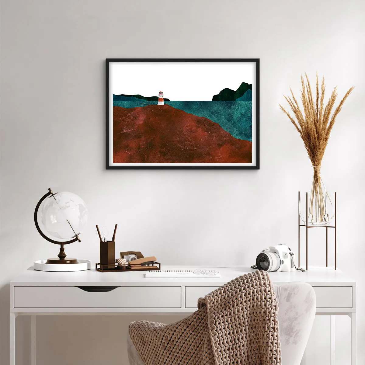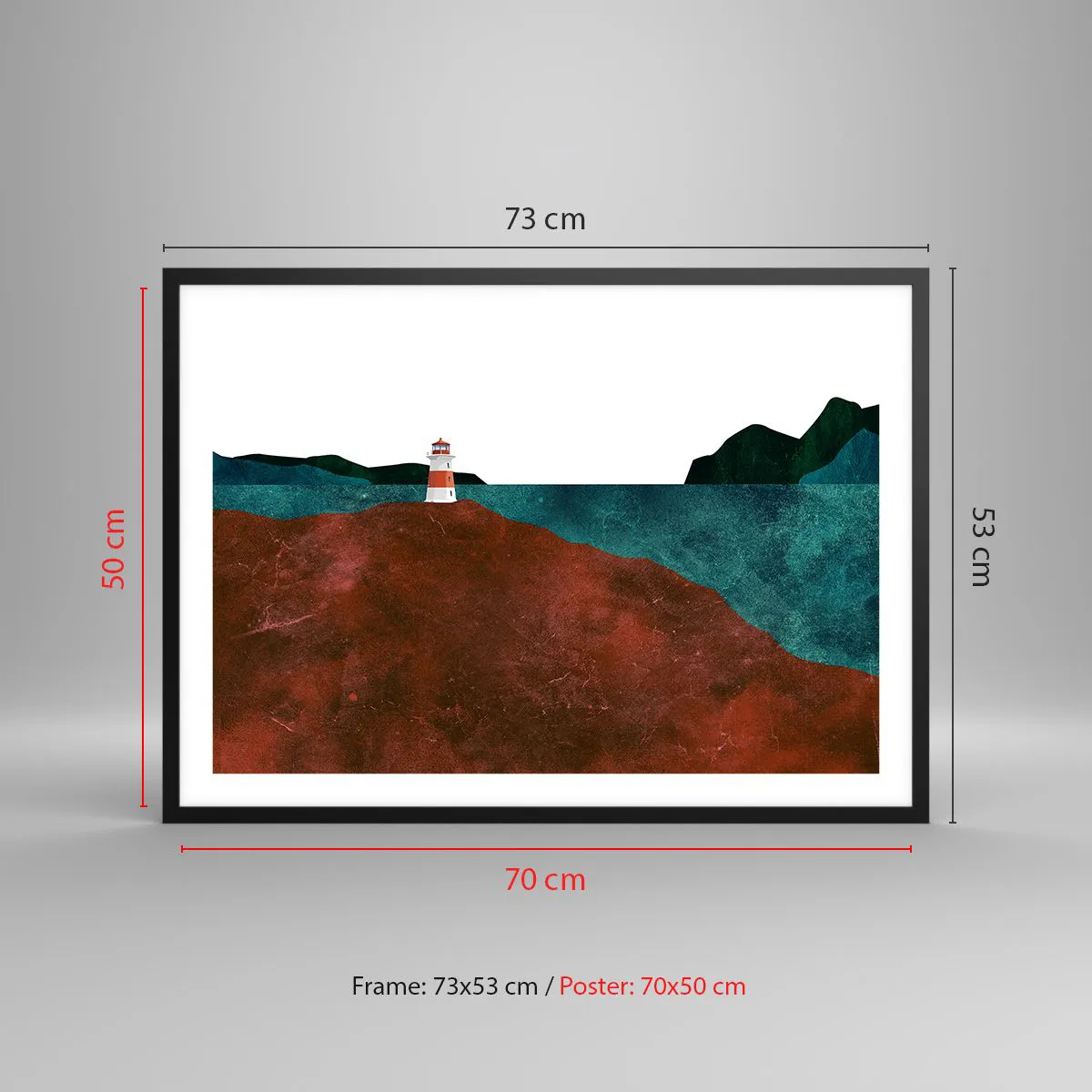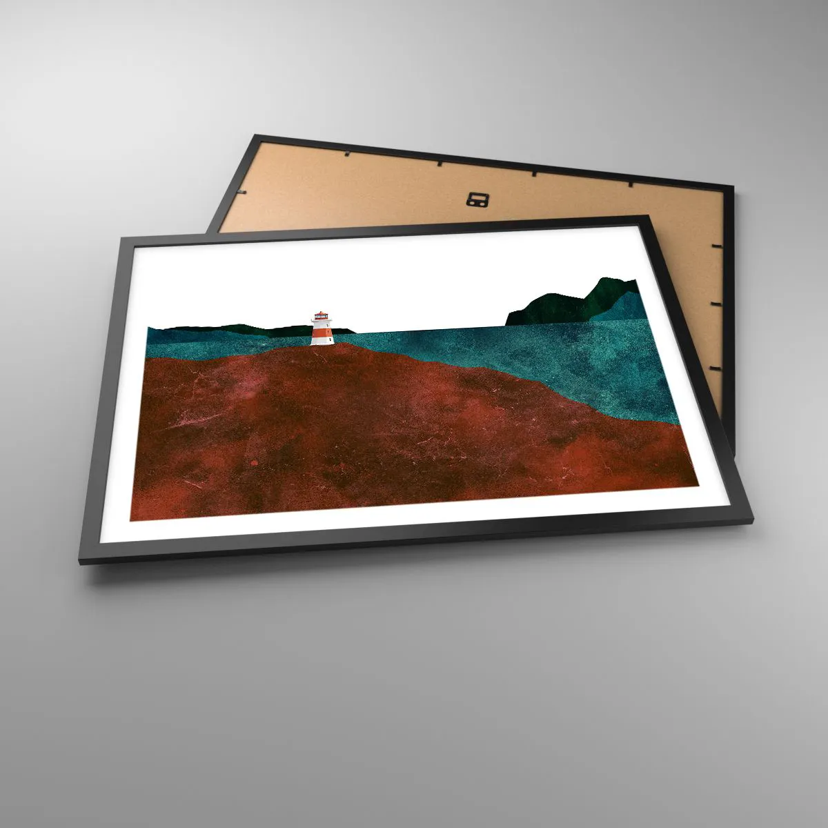 Affiche dans un cadre noir - Poster - Un phare avec en toile de fond les montagnes et la mer - 70x50cm - En regardant la mer - Décoration murale moderne pour le salon et la chambre ARTTOR