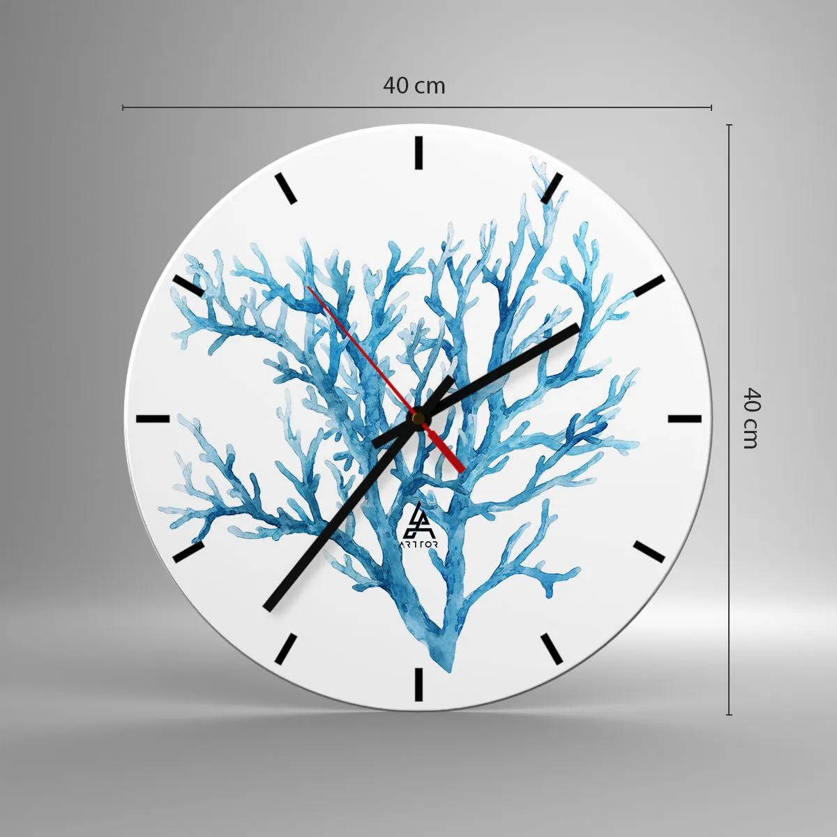 L'horloge est produite avec un verre de sécurité de 4 mm d'épaisseur. La technologie de fabrication de l'horloge est conforme à la classe de sécurité 2B2 selon la norme PN-EN 12600 : 2004, qui garantit la résistance aux chocs. L'horloge en verre est prête à être accrochée - elle a une attache en métal attaché à l'arrière et une entretoise en mousse régulant la distance uniformément de l'horloge par rapport au mur. L'horloge a un mécanisme flottant silencieux alimenté par une pile 1.5V - pile AA (pile non incluse).