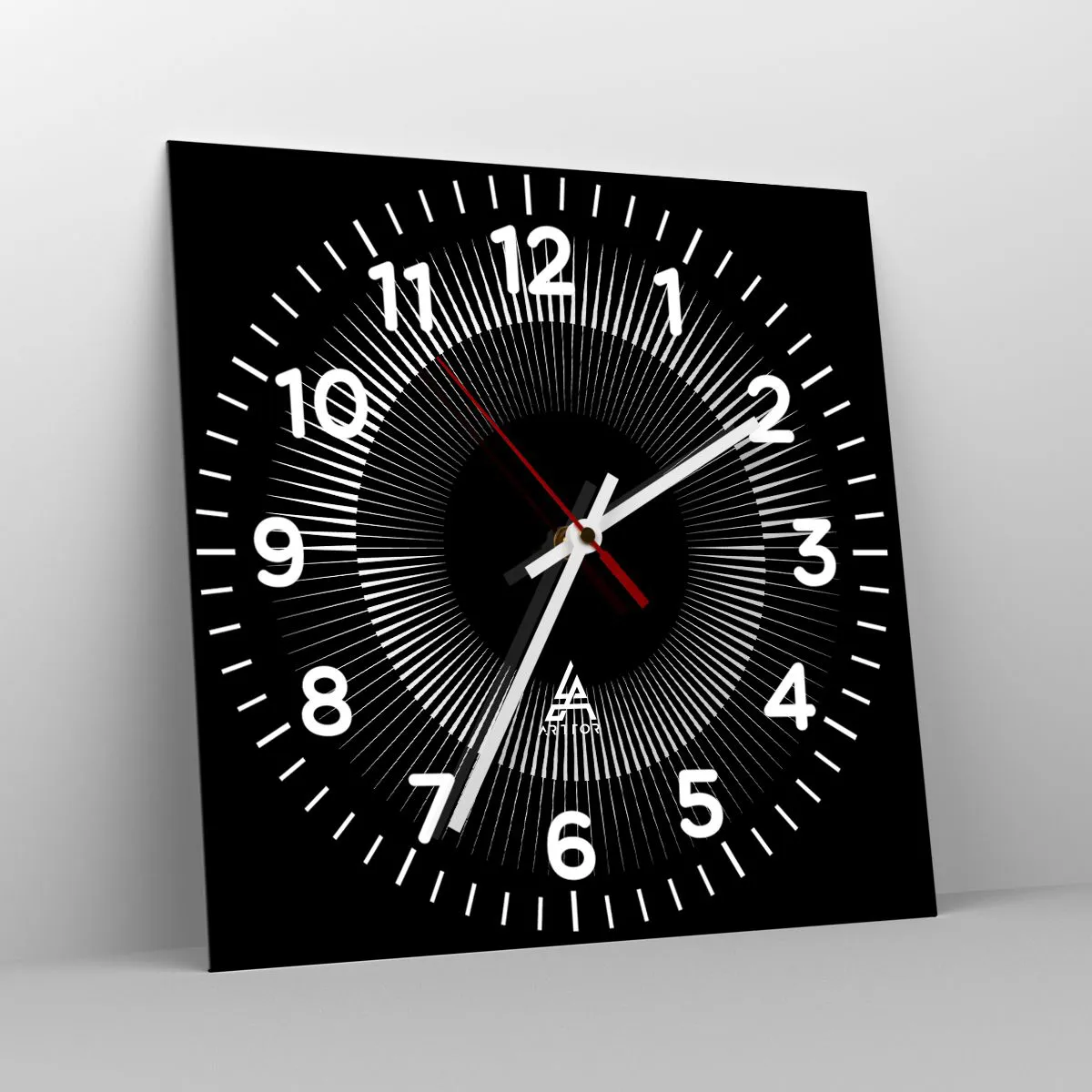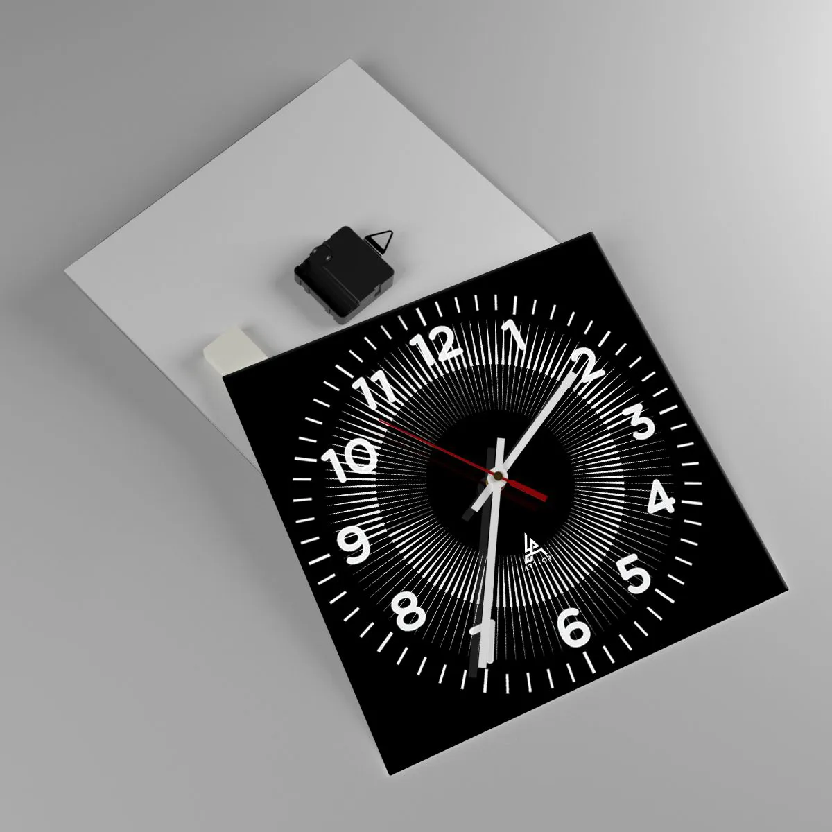 L'horloge est produite avec un verre de sécurité de 4 mm d'épaisseur. La technologie de fabrication de l'horloge est conforme à la classe de sécurité 2B2 selon la norme PN-EN 12600 : 2004, qui garantit la résistance aux chocs. L'horloge en verre est prête à être accrochée - elle a une attache en métal attaché à l'arrière et une entretoise en mousse régulant la distance uniformément de l'horloge par rapport au mur. L'horloge a un mécanisme flottant silencieux alimenté par une pile 1.5V - pile AA (pile non incluse).