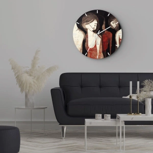Le fond minimaliste et les espaces noirs dominants confèrent à l'ensemble une dimension théâtrale, tandis que la répétition des figures introduit rythme et structure. Ce tableau sera parfait comme point focal dans un salon, une chambre, un atelier d'art ou un intérieur contemplatif. Pour les personnes sensibles à l'art figuratif et aux messages émotionnels, cette horloge deviendra non seulement un objet du quotidien, mais aussi un sujet de conversation.
