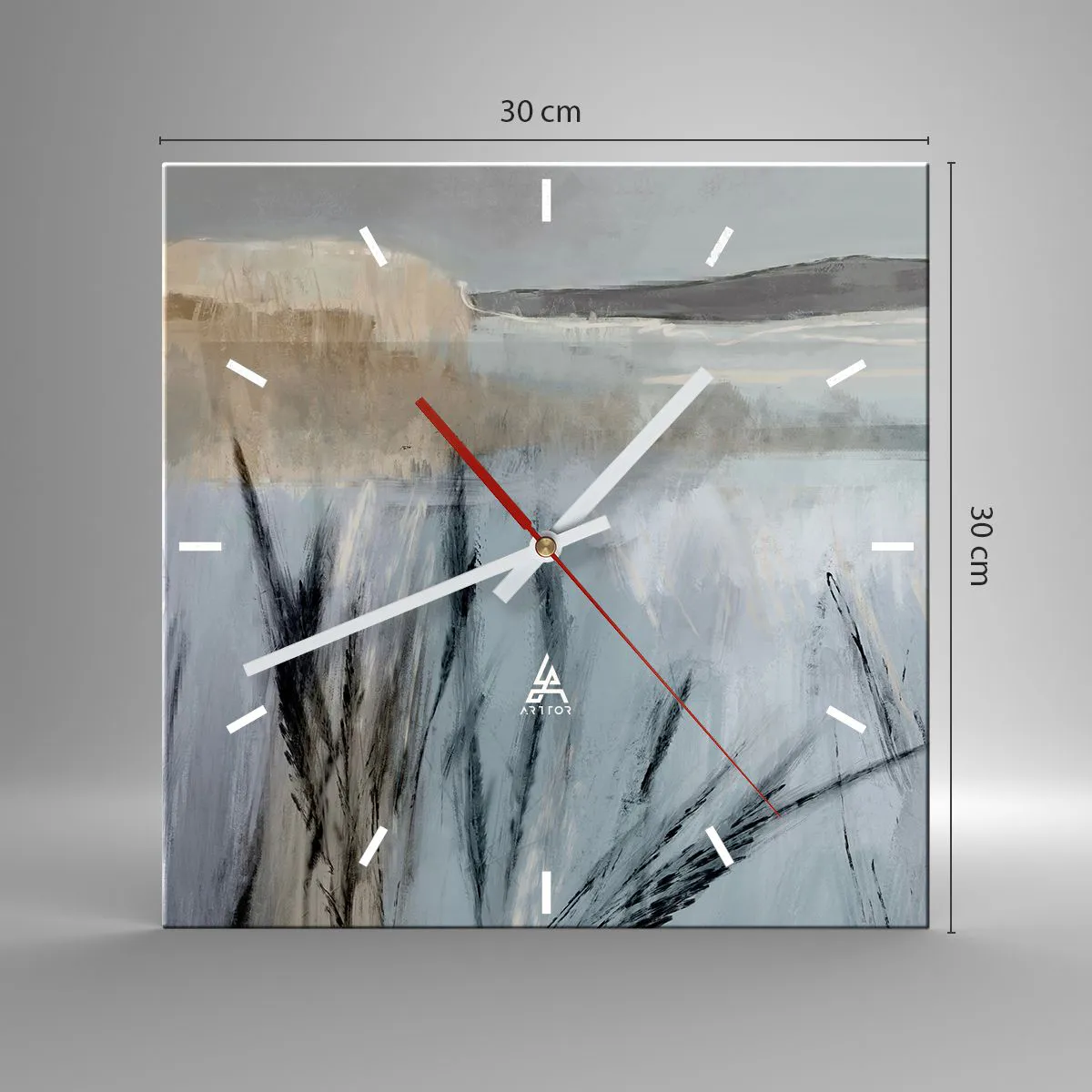 L'horloge est produite avec un verre de sécurité de 4 mm d'épaisseur. La technologie de fabrication de l'horloge est conforme à la classe de sécurité 2B2 selon la norme PN-EN 12600 : 2004, qui garantit la résistance aux chocs. L'horloge en verre est prête à être accrochée - elle a une attache en métal attaché à l'arrière et une entretoise en mousse régulant la distance uniformément de l'horloge par rapport au mur. L'horloge a un mécanisme flottant silencieux alimenté par une pile 1.5V - pile AA (pile non incluse).