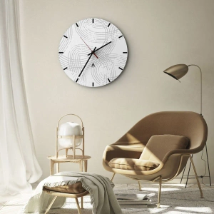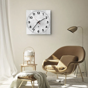 L'horloge est produite avec un verre de sécurité de 4 mm d'épaisseur. La technologie de fabrication de l'horloge est conforme à la classe de sécurité 2B2 selon la norme PN-EN 12600 : 2004, qui garantit la résistance aux chocs. L'horloge en verre est prête à être accrochée - elle a une attache en métal attaché à l'arrière et une entretoise en mousse régulant la distance uniformément de l'horloge par rapport au mur. L'horloge a un mécanisme flottant silencieux alimenté par une pile 1.5V - pile AA (pile non incluse).