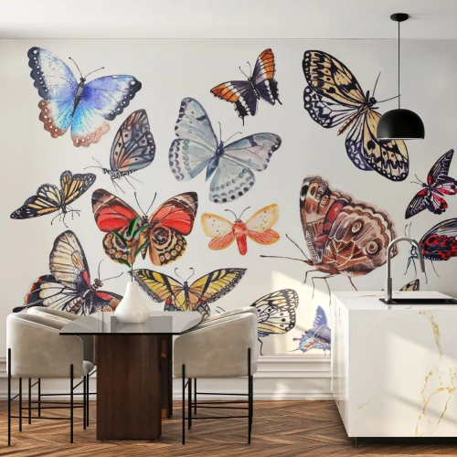 Papier Peint Photo Premium Canvas - Essaim de dentelle et de couleurs - Pour les enfants, Papillons colorés, Graphique - 300x210 cm