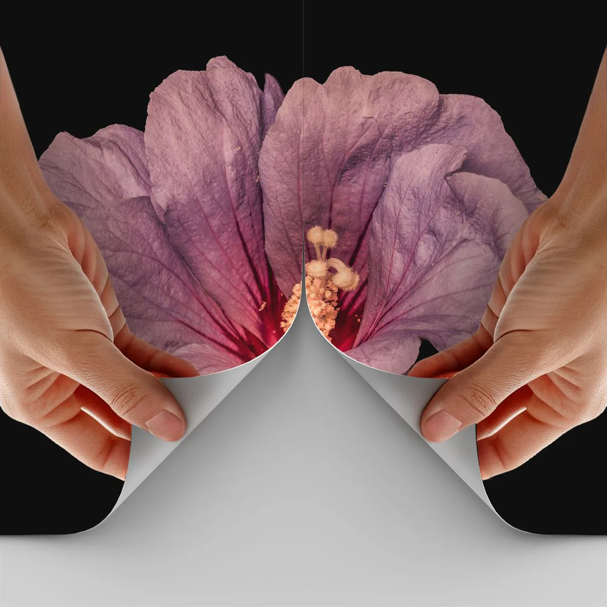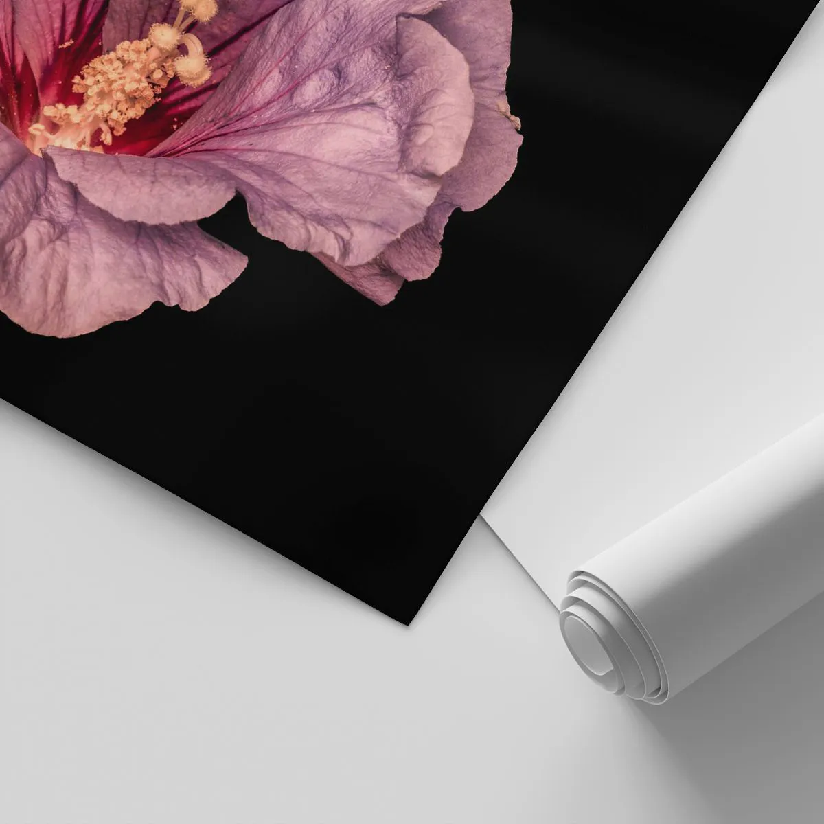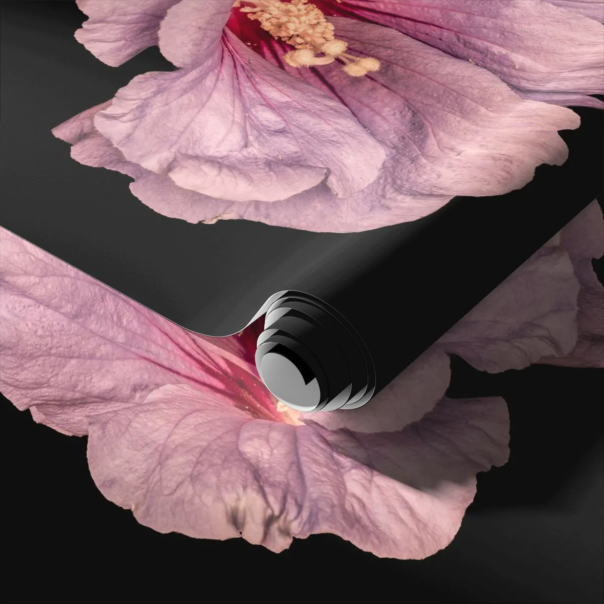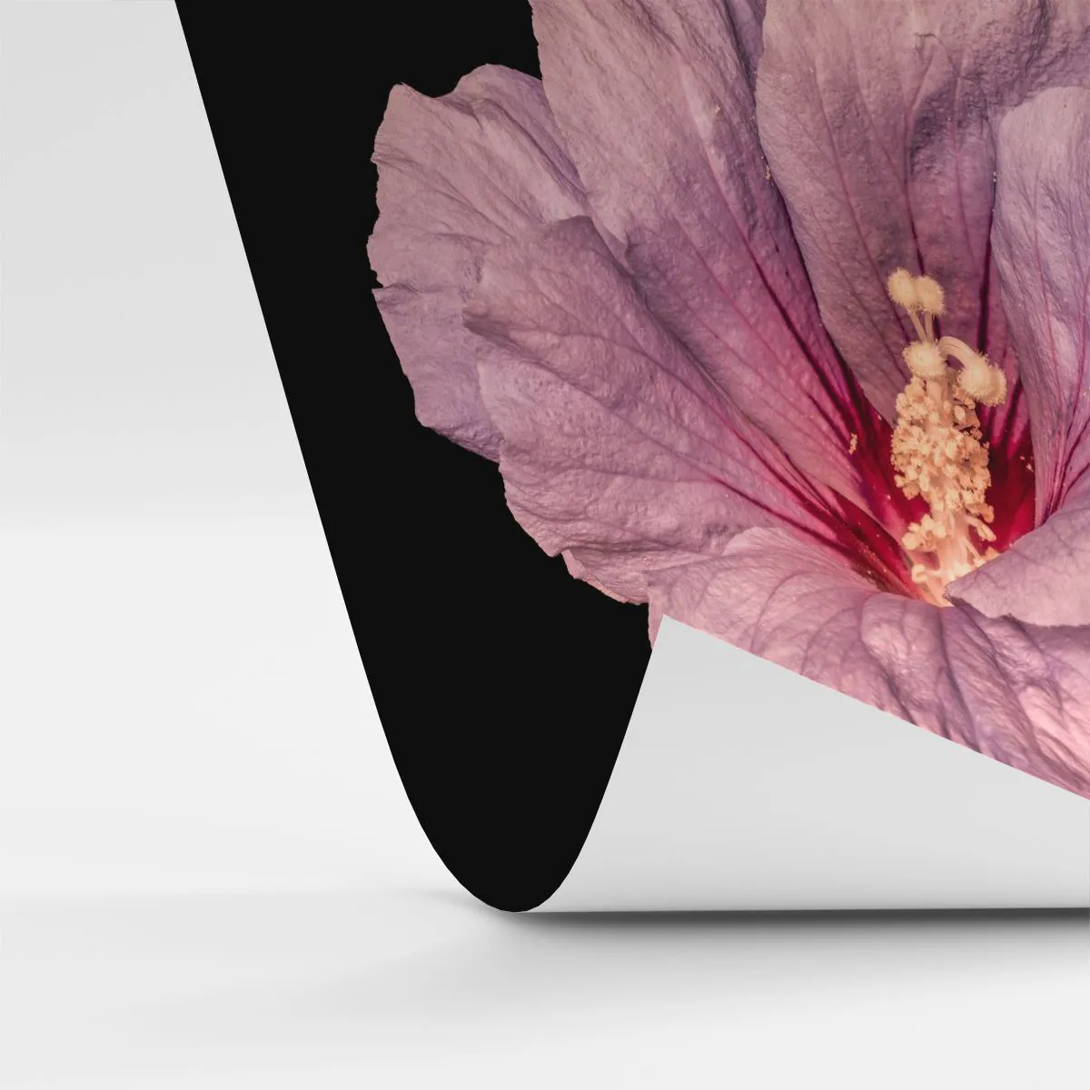 - Gros plan d'une fleur d'hibiscus rose sur fond noir, mettant en valeur ses pétales délicats et ses détails expressifs. Une décoration parfaite pour les intérieurs inspirés par la nature et l'élégance.