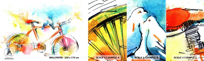 Échantillon De Papier Peint Standard Eco - À deux en vélo - Abstraction, Vélo, Des oiseaux - 100x30 cm