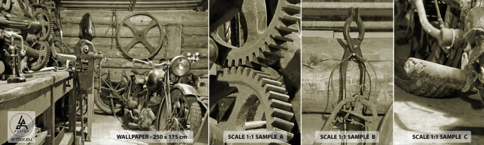 Échantillon De Papier Peint Standard Eco - Dans le hangar de l'oncle Władek - Moto, Atelier de réparation automobile, Ancien - 100x30 cm