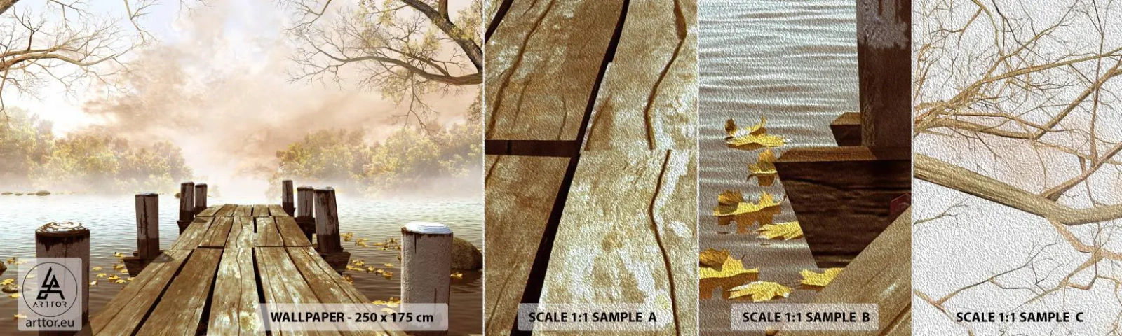 Échantillon de Papier Peint Premium Sand - La douce tristesse de l'automne - Paysage, Lac, Pont de bois - 100x30 cm