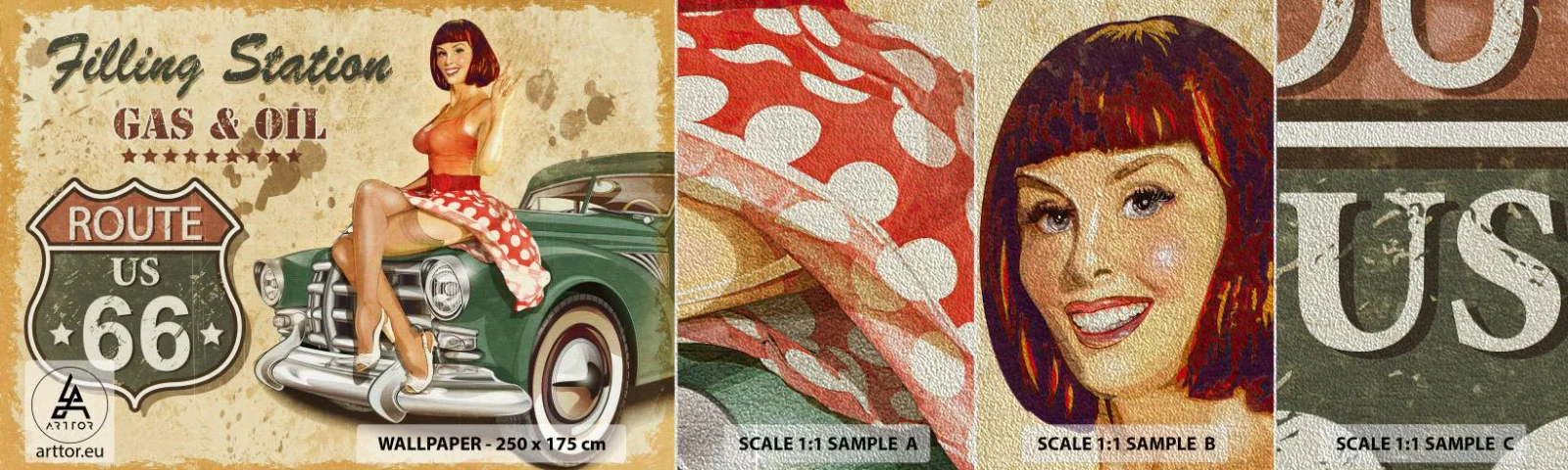 Échantillon de Papier Peint Premium Sand - Les superbes années 40. - Route 66, Voiture, Automobile - 100x30 cm