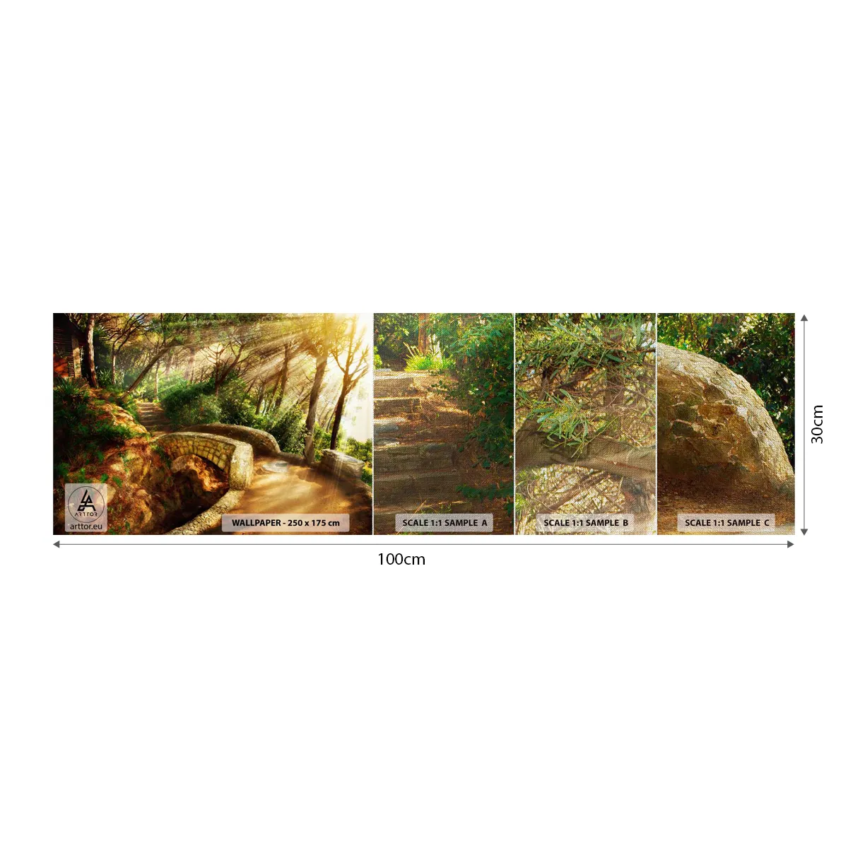 Échantillon de Papier Peint Premium Canvas - Directement du pont dans une forêt de conte de fées - Paysages, Escaliers en pierre, Rayons du soleil - 100x30 cm
