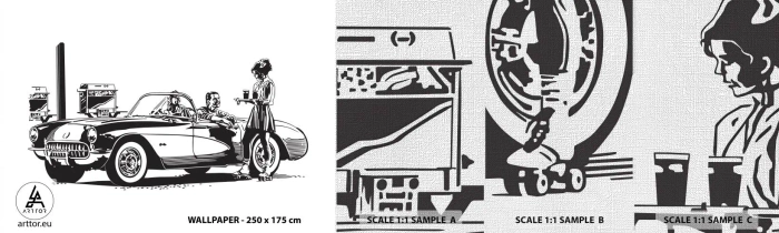 Échantillon de Papier Peint Premium Canvas - 60's - Amérique insouciante - Voiture ancienne, Station-essence, Amérique - 100x30 cm