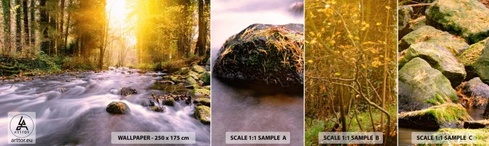 Échantillon de Papier Peint Autocollant Deluxe Sticker - Malachite dans un cadre argent et or - Paysage, Ruisseau de montagne, Forêt - 100x30 cm