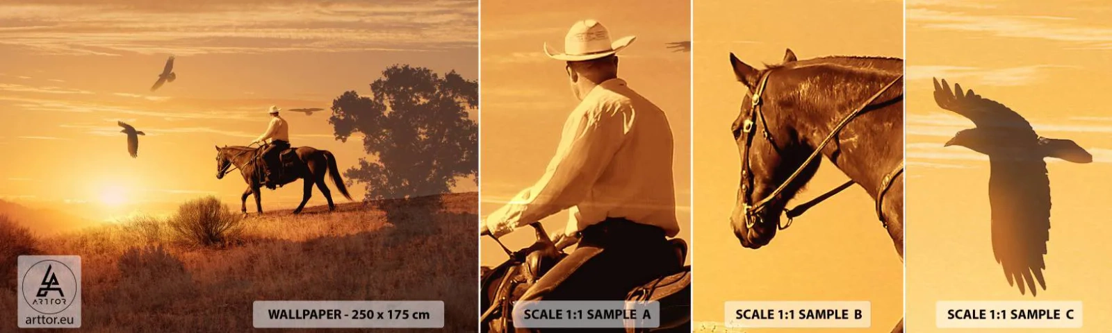 Échantillon de Papier Peint Autocollant Deluxe Sticker - Seul à travers la prairie - Cheval, Cow-boy, Paysage - 100x30 cm