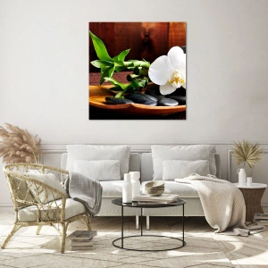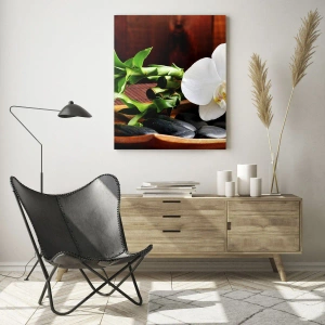 - Le tableau représente une orchidée blanche disposée sur des pierres noires et du bambou dans un bol en bois. La photo évoque une atmosphère de détente et d'harmonie, parfaitement adaptée aux intérieurs de style zen.