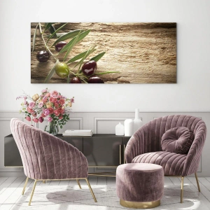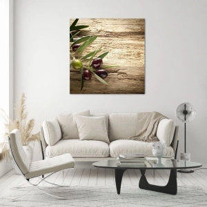 - Ce tableau représente une branche d'olivier avec des olives mûres sur un fond en bois naturel. Il est parfait pour décorer une cuisine, un salon ou tout intérieur rustique ou méditerranéen.