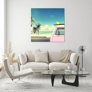 Impression sur verre - Image sur verre - Une plage avec des palmiers et une camionnette rétro rose au bord de la mer - 70x50cm - Il est temps de commencer les vacances - Décoration murale moderne pour le salon et la chambre ARTTOR