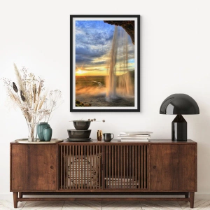 Affiche dans un cadre noir - Poster - Une cascade à la lumière du soleil couchant sur fond de paysage - 50x70cm - Le monde derrière un voile de gouttes - Décoration murale moderne pour le salon et la chambre ARTTOR