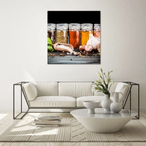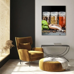 Impression sur verre - Image sur verre - Épices colorées dans des pots sur fond sombre - 100x70cm - Pour que la vie ait du goût - Décoration murale moderne pour le salon et la chambre ARTTOR