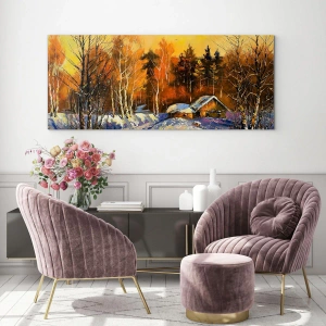 Impression sur verre - Image sur verre - Paysage d'hiver avec un chalet en bois au coucher du soleil - 50x70cm - Impression d'hiver au soleil - Décoration murale moderne pour le salon et la chambre ARTTOR
