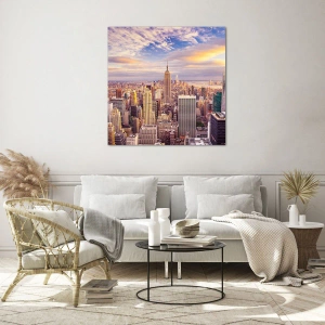 Impression sur verre - Image sur verre - Panorama de la ville avec des gratte-ciels au coucher du soleil - 50x70cm - Atteindre les nuages