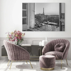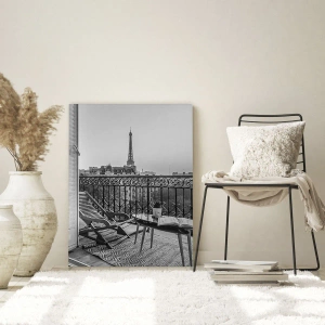 Après-midi parisien est une peinture qui capture la vue romantique depuis un balcon parisien. Par la porte ouverte, on aperçoit l'architecture classique de Paris, avec la tour Eiffel en arrière-plan, au milieu d'élégants balcons et terrasses. Au premier plan, une table avec un livre et une plante crée une atmosphère paisible, idéale pour se détendre un jour d'été. Le noir et blanc du tableau ajoute une touche nostalgique, soulignant l'élégance intemporelle de cette vue parisienne.