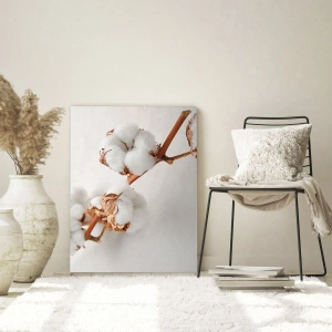 • Gros plan d'une branche de coton naturel sur fond clair. Une composition délicate et subtile sur verre au format paysage 70 x 50 cm, idéale pour les intérieurs inspirés par la nature et le minimalisme.
