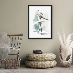 Affiche dans un cadre noir - Poster - Une danseuse de ballet dans une pose de ballet sur un fond de tons aquarelle délicats. - 70x50cm - Enchantement du cygne - Décoration murale moderne pour le salon et la chambre ARTTOR